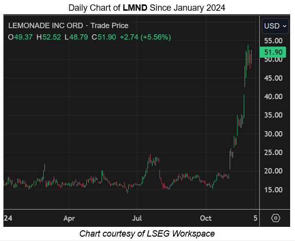 Insurance stock Lemonade (LMND) is staging a post-earnings breakout higher from the basing pattern it had been following since 2022. The stock ended the week above $50 and sports a more than 220% year-to-date lead, but could still have room to run.