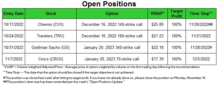 - The Goldman Sachs (GS) January 20, 2023, 340-strike call was closed after hitting its target profit of +100%. If you have not already done so, please close out of your GS position at the earliest opportunity.