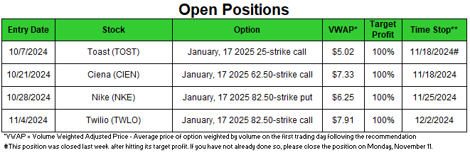 - The Toast (TOST) January 17, 2025, 25-strike call was closed after hitting its target profit of +100%. If you have not already done so, please close out of your TOST position at the earliest opportunity.