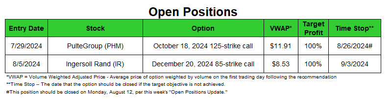 Amazon.com (AMZN)Place a limit order to buy the Amazon.com (AMZN) October 18, 2024 170-strike put at a limit price within range of the current market asked price when you place your order. At the close on Friday, August 9, this option was offered at $9.30. AMZN closed at $166.94 on Friday, August 9.Do not attempt to enter this position after Monday's close.Please use the following guidelines to manage the position:- Exit the position if the option is at a 100% gain from your entry price.