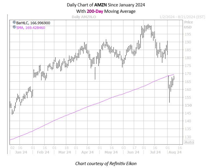 Shares of Amazon.com (AZMN) have rallied into the 200-day moving average this week on low volume. The equity had previously gapped below this trendline on Aug. 2 after earnings, but retail investors that accumulated shares at a major brokerage house between February and July are now underwater.