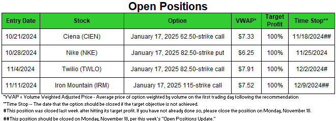 - The Twilio (TWLO) January 17, 2025, 82.50-strike call was closed after hitting its target profit of +100%. If you have not already done so, please close out of your TWLO position at the earliest opportunity.