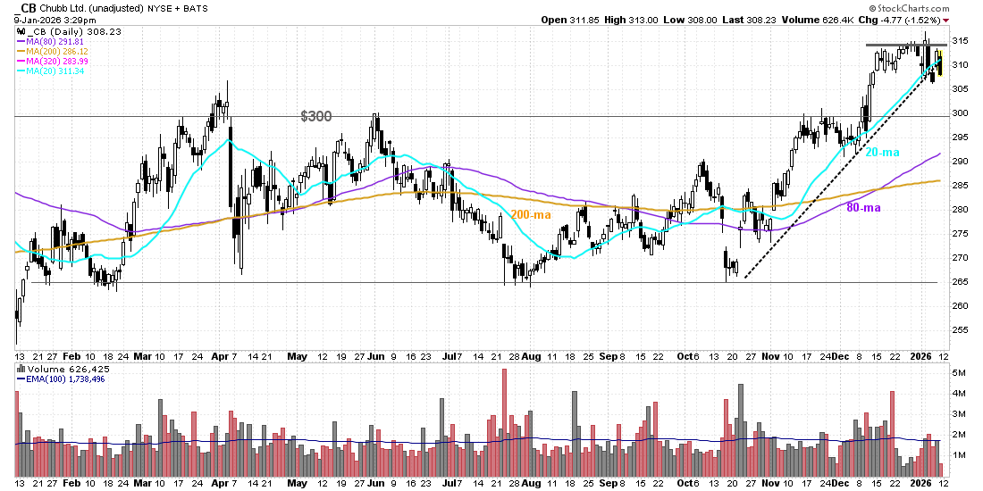 RECOMMENDATION: Place a market order to buy (to open) Chubb (CB) January 16, 2026 310-strike put. We recommend targeting a gain of 300% on the trade (4x your purchase price), with the Optimal Entry Zone between $305 and $309. At the close on Friday, January 9, this option was offered at $4.90. CB closed at $306.81 on Friday, January 9.