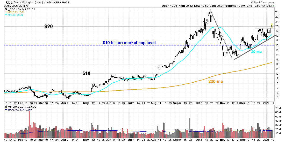 RECOMMENDATION: Place a market order to buy (to open) Coeur Mining (CDE) January 16, 2026 20-strike call. We recommend targeting a gain of 300% on the trade (4x your purchase price), with the Optimal Entry Zone between $20 and $21. At the close on Friday, January 9, this option was offered at $1.15. CDE closed at $20.40 on Friday, January 9.