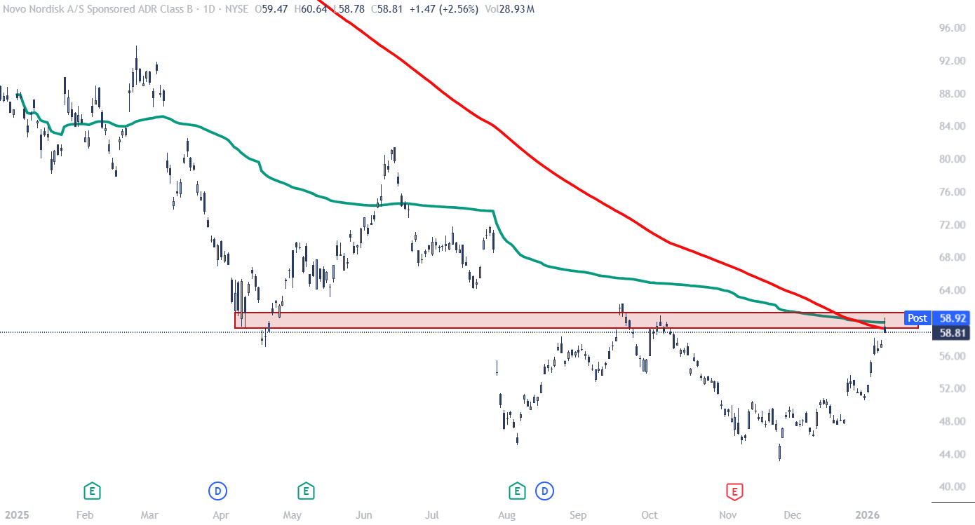 RECOMMENDATION: Place a market order to buy (to open) Novo Nordisk (NVO) January 16, 2026 59-strike put. We recommend targeting a gain of 300% on the trade (4x your purchase price), with the Optimal Entry Zone between $58 and $60. At the close on Friday, January 9, this option was offered at $1.50. NVO closed at $58.81 on Friday, January 9.