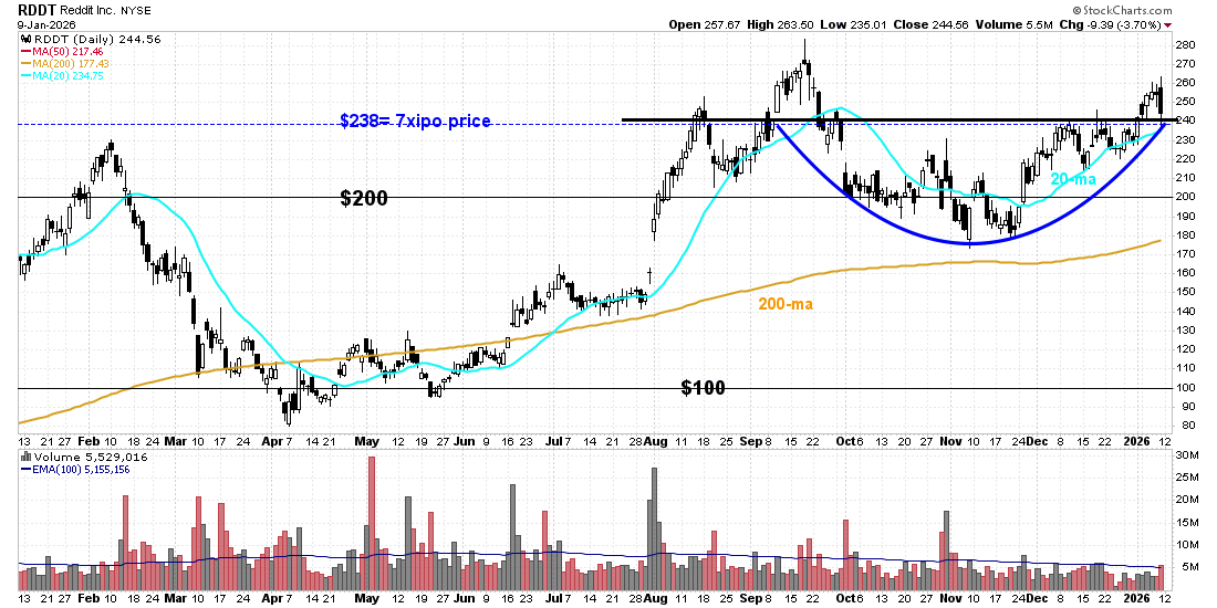 RECOMMENDATION: Place a market order to buy (to open) Reddit (RDDT) January 16, 2026 242.50-strike call. We recommend targeting a gain of 300% on the trade (4x your purchase price), with the Optimal Entry Zone between $242.50 and $247.50. At the close on Friday, January 9, this option was offered at $9.70. RDDT closed at $244.56 on Friday, January 9.