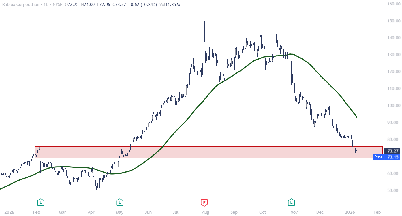 Shares of Roblox (RBLX) recently pulled back to their early 2025 weekly closing highs, with price now trading near their first day IPO close. There is put support at the 70-strike, with the security finding lows any time it nears this region, making now an excellent time to buy calls.