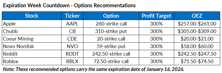 RECOMMENDATION: Place a market order to buy (to open) Apple (AAPL) January 16, 2026 260-strike call. We recommend targeting a gain of 300% on the trade (4x your purchase price), with the Optimal Entry Zone between $257 and $261. At the close on Friday, January 9, this option was offered at $2.88. AAPL closed at $259.37 on Friday, January 9.